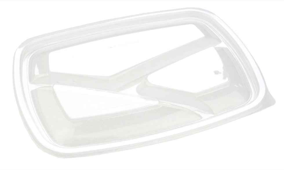 Couvercle en PP micro-ondable pour barquette rectangulaire Fastpac 3 compartiments 900ml. Notre couvercle en polypropylène est une solution entièrement résistante à la chaleur et est micro-ondable. Il est d'excellente qualité et contient minimum 30% de matériaux recyclés. Le PP offre une excellente visibilité des produits en rayon.