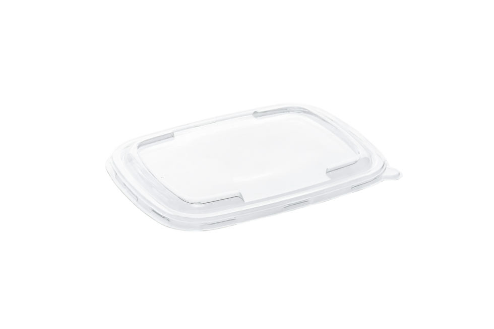 Couvercle en rPET transparent pour barquette rectangulaire laminée 21x16cm. Choisissez nos couvercles antibuée en PET recyclé post-consommation qui garantissent que vos aliments restent visibles à tout moment. Le couvercle en rPET vous assure une visibilité du produit maximale et est composé d'un minimum de 50% de matériaux recyclés.