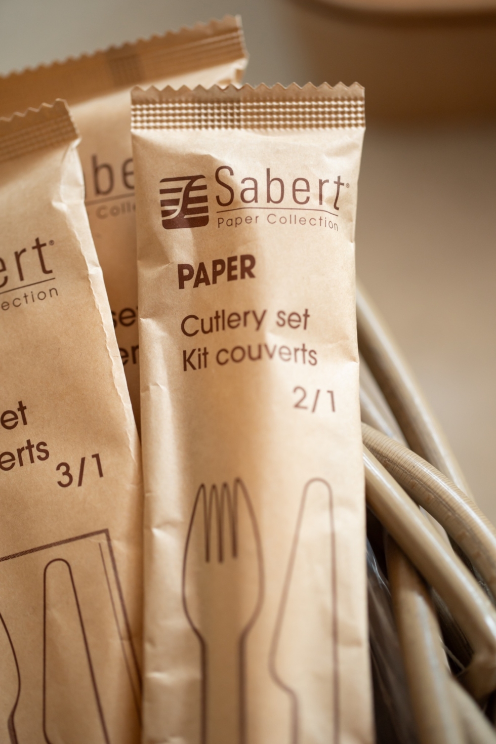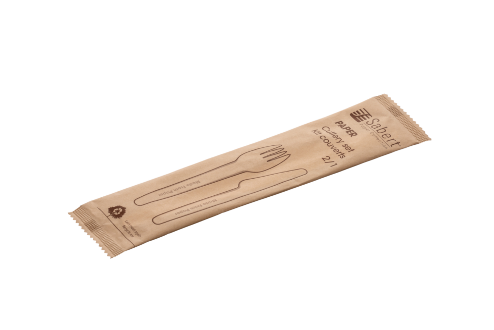 Kit couverts composé de la nouvelle gamme brevetée de couverts en papier jetables Sabert (couteau et fourchette). Cette gamme allie durabilité et performances exceptionnelles en termes de rigidité et de qualité de coupe. Élégants et robustes, ils sont d'une longueur parfaite pour une manipulation aisée et une sensation de douceur agréable. Excellente performance avec les aliments chauds et réfrigérés.