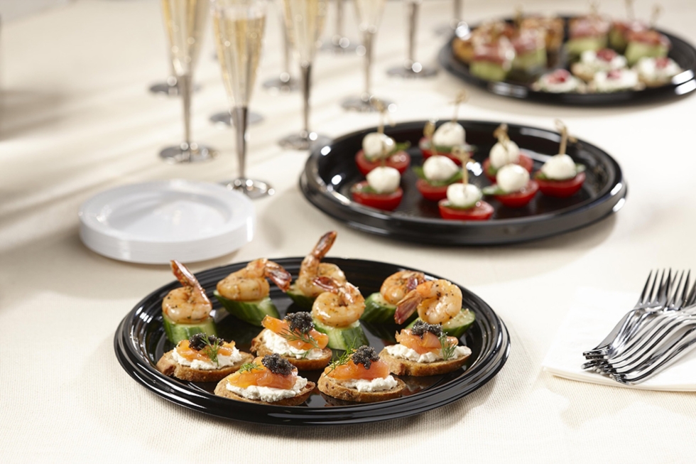 Sabert offers the largest assortment of recycled and recyclable PET platters trays and lids, with a very large choice of design, colours and dimensions. Thanks to an exclusive lamination process, Sabert black, marble, but also silver Platters offer outstanding renders with perfect illusion of stainless steel and reusable catering platters and become the best sandwich trays with lids option!