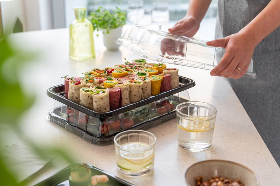 High clarity rPET domed clear lid that perfectly fits rectangular platter 35x24cm. Choose our anti-fog post consumer recycled PET lids that ensure your food remains on show at all times. The rPET lid ensures maximum product visibility and is made from at least 50% recycled materials.